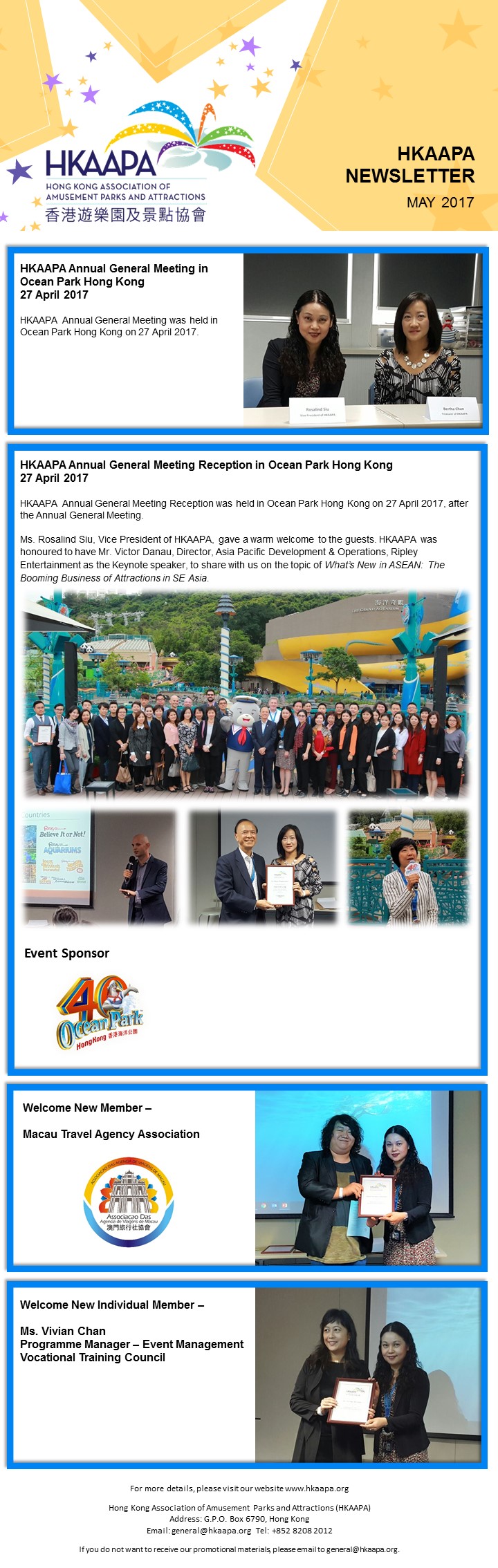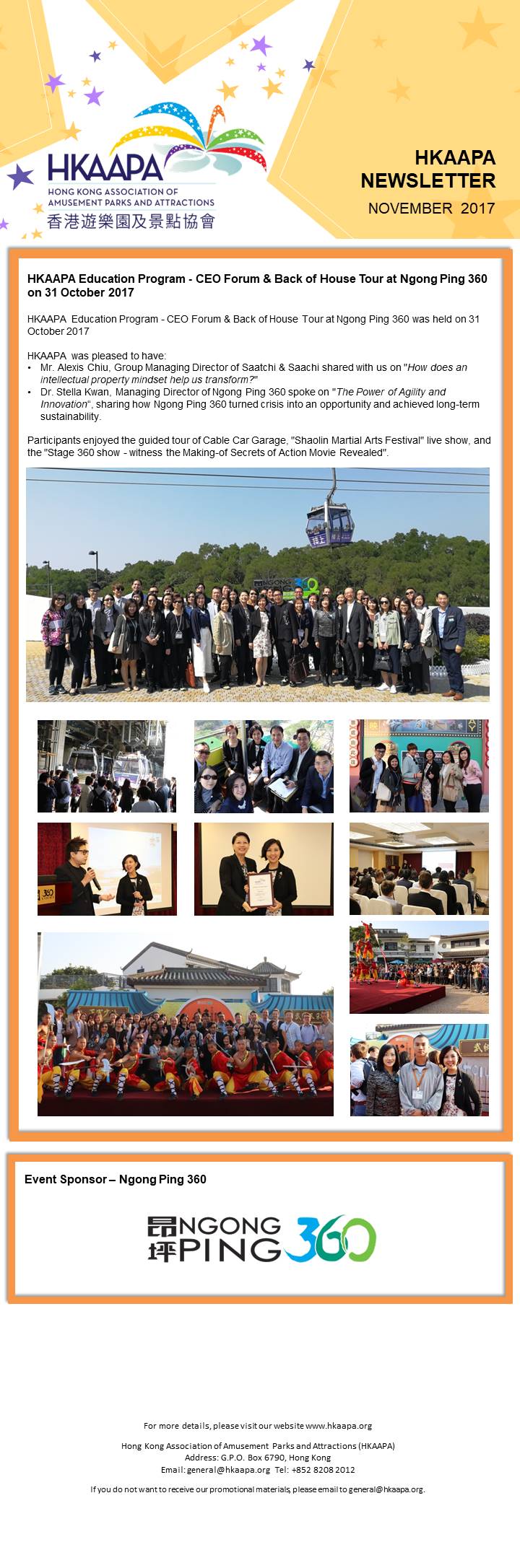 (2017 年 8 月 9 日 – 香港) 香港遊樂園及景點協會(協會)就香港特區政府今天與國家旅遊局 簽署《關於進一步深化內地與香港旅遊合作協議》(協議),達成五項共識,進一步加強雙方的旅 遊發展交流合作,表示歡迎。協議將有助本港旅遊業界拓展市場及客源,對香港旅遊業朝多元市 場發展,有積極的作用。與此同時,我們認同香港和國家加強旅遊監管合作,並建立定期溝通協 調機制,此舉將有助提升香港旅遊業的質素及長遠競爭力。