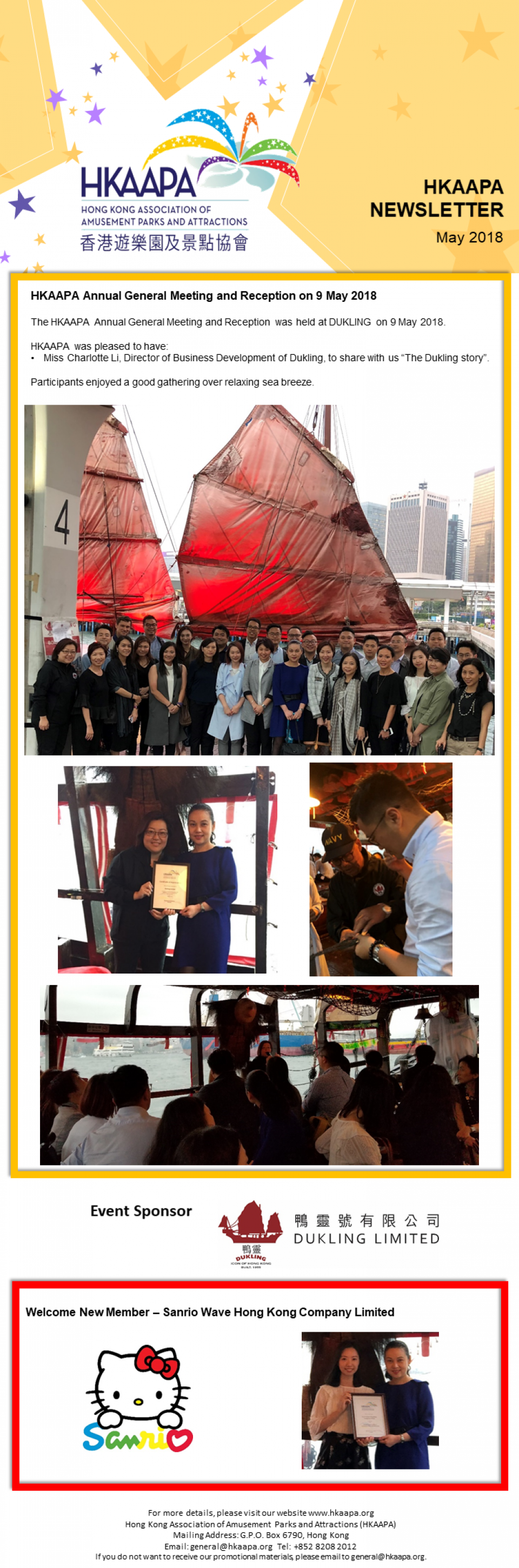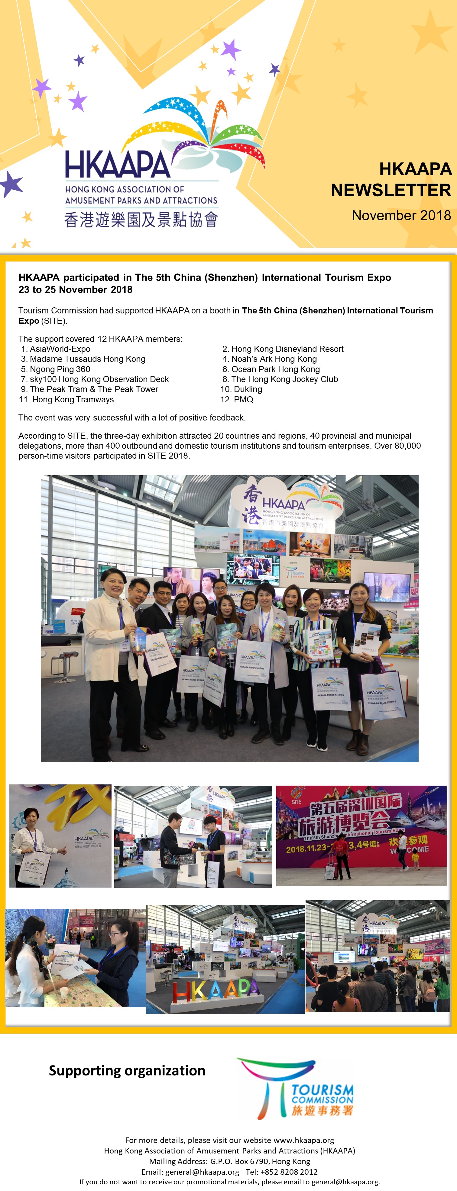 About HKAAPA Founded in 2012, the Hong Kong Association of Amusement Parks and Attractions (HKAAPA) is an association with a mission to unite amusement parks and attractions in Asia, working closely together to promote tourism, connect members with manufacturers and suppliers, develop young professionals and ensure the continued success of the attractions industry and Hong Kong tourism. We serve as ambassadors to promote a positive image of the industry and be a voice to the government and public on industry matters. Founder members and board members of HKAAPA include AsiaWorld-Expo, Hong Kong Disneyland Resort, Madame Tussauds Hong Kong, Ngong Ping 360, Noah’s Ark Hong Kong, Ocean Park Hong Kong, sky100 Hong Kong Observation Deck, the Hong Kong Jockey Club and The Peak Tram & The Peak Tower.