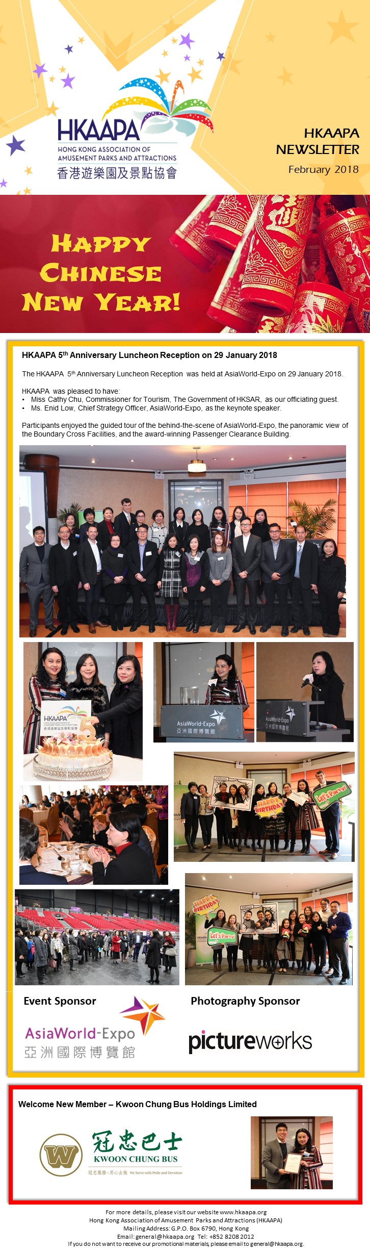 (29 January 2017─Hong Kong) The Hong Kong Association of Amusement Parks and Attractions (HKAAPA) aims at connecting amusement parks and attractions throughout Hong Kong and the region in fostering local tourism. To mark its 5th milestone, 8 founder members and board members (AsiaWorld-Expo, Hong Kong Disneyland Resort, Ngong Ping 360, Noah’s Ark Hong Kong, Ocean Park Hong Kong, sky100 Hong Kong Observation Deck, The Hong Kong Jockey Club and The Peak Tram & The Peak Tower) celebrated at the anniversary luncheon held in AsiaWorld-Expo today with Cathy Chu, Commissioner for Tourism, joined as the officiating guest.